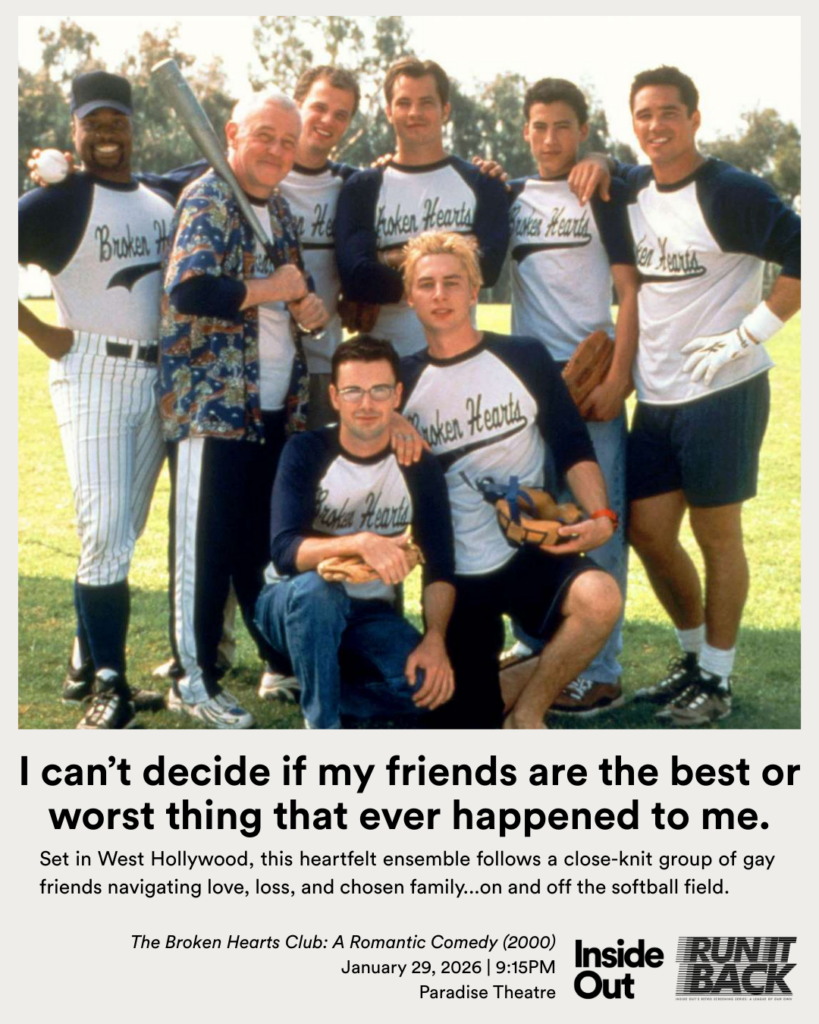 Starring a young cast of future stars including Timothy Olyphant, Dean Cain, Billy Porter and Zack Braff,The Broken Hearts Club: A Romantic Comedyis a queer classic film that is admittedly light on baseball, but so big on heart we couldn’t pass up the opportunity to include it. -INSIDE OUT
