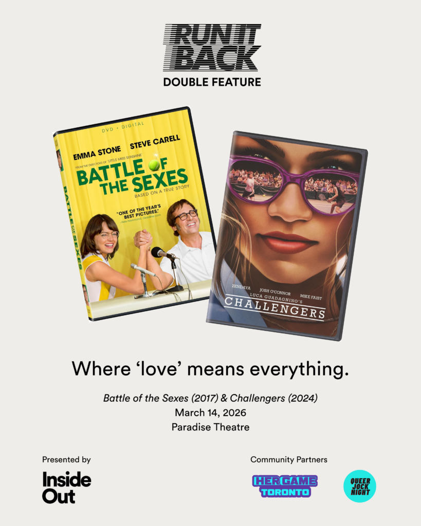 Run It Back: A League of Our Own returns on March 14 at the Paradise Theatre with queer tennis favourites Challengers and Battle of the Sexes! 🎾 Join us for our 2SLGBTQ+ sports screening series for some gay tension and lots of serves.