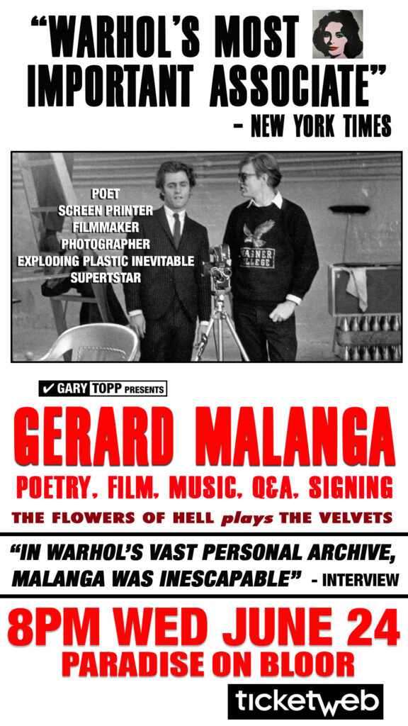 Malanga was heavily involved in Warhol’s filmmaking. Warhol’s famous three-minute “screen tests” stemmed from Gerard’s idea of creating a publicity photo of himself using movie film. Warhol and Malanga went on to create 500 screen tests of some of the most famous and unknown visitors to The Silver Factory. Malanga was active in many of the early Warhol films, including Chelsea Girls (1966); and co-produced Bufferin (1967) in which he reads his poetry, deemed to be the longest spoken-word movie on record at 33-minutes nonstop.In 1966, Malanga became a creative collaborator and choreographer with the legendary rock group Velvet Underground, part of Warhol’s multimedia presentation, the Exploding Plastic Inevitable.In 1969, Malanga was one of the founding editors of Interview magazine, along with Warhol and John Wilcock.In December 1970, Malanga left Warhol’s studio to pursue his work in poetry and photography.A lifelong poet, he’s been publishing his acclaimed poetry for decades. He was already a published poet before he went to work for Andy Warhol in 1963. Gerard writes poetry every day of his life. He’s the author of over a dozen books of poetry spanning a 50-year period, including 2019’s “Cool and other things” (Bottle of Smoke Press). In June 2024, he published his latest book of poetry called “Odie is Being Called Back & Other Poems” (Bottle of Smoke Press). He is the co-author (with Victor Bockris) of Up-Tight: The Velvet Underground Story. Malanga recently completed his memoirs, In Remembrance of Things Past. His work has appeared in Poetry, Yale Review, Harvard Review, Paris Review, Raritan, Partisan Review and The New Yorker. In 2014, he was named the Official Poet of the annual Glasgow Arts International. In 2024, Gerard was named a Chevalier of the Ordre des Arts et des Lettres by the French Ministry of Culture.THE FLOWERS OF HELL is a Lou Reed-approved London/Toronto experimental ensemble that plays the Velvet Underground. It will accompany Gerard Malanga’s film “Andy Warhol: Portrait of the Artist as a Young Man” (1964).