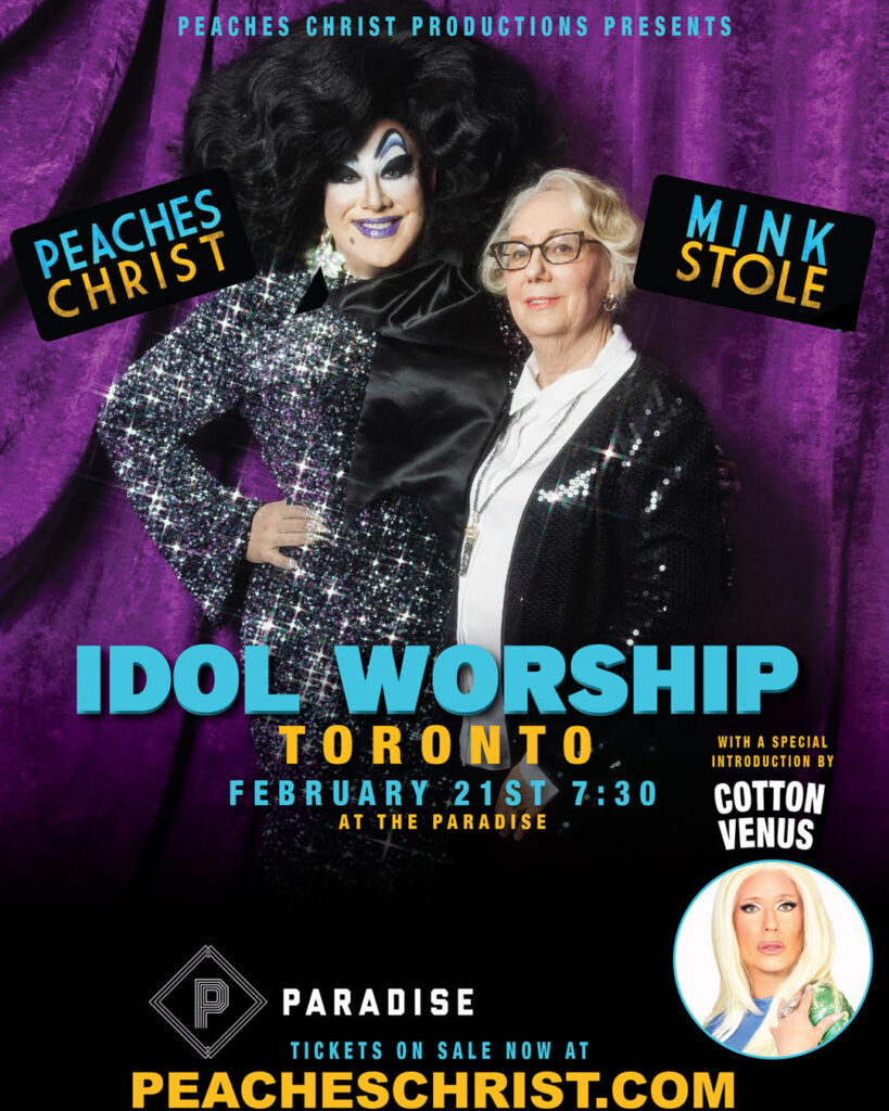 Legend meets legend in this spectacular Toronto Premiere of IDOL WORSHIP, the acclaimed onstage conversation and performance event starring cult film icon MINK STOLE and drag impresario PEACHES CHRIST. For one unforgettable night, the queens of underground cinema and counterculture unite at The Paradise to celebrate Mink’s legacy, career, scandal, glamour, and divine weirdness from her early days with John Waters and the Dreamlanders to her decades of scene-stealing film, stage, and music work. Hosted and hilariously guided by Peaches Christ, Idol Worship is part interview, part concert, and part love letter to one of the most important queer figures in cult cinema history. Expect outrageous stories, revelations, film clips, rare archival moments. The evening begins with a special introduction by Toronto’s own Cotton Venus, kicking off a celebration worthy of a midnight movie goddess. A must-attend for fans of John Waters, counterculture film, drag, filth, glamour, and unrepentant camp. One night only. Do not miss it.
