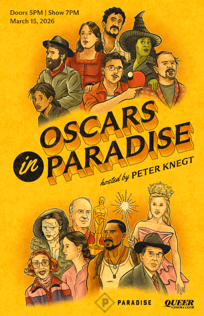 On the evening of March 15th, Paradise Theatre is going to be throwing our fourth annual Oscar viewing party – and you are cordially invited to join us. Hosted by the CBC’s Peter Knegt (who also runs the fabulous Queer Cinema Club series at the Paradise), this Oscar party is going to have everything: drinks, food, incredible prizes, a best dressed contest, a good old fashioned Oscar prediction pool, and of course, a live screening of the awards themselves up on the big screen where they belong.